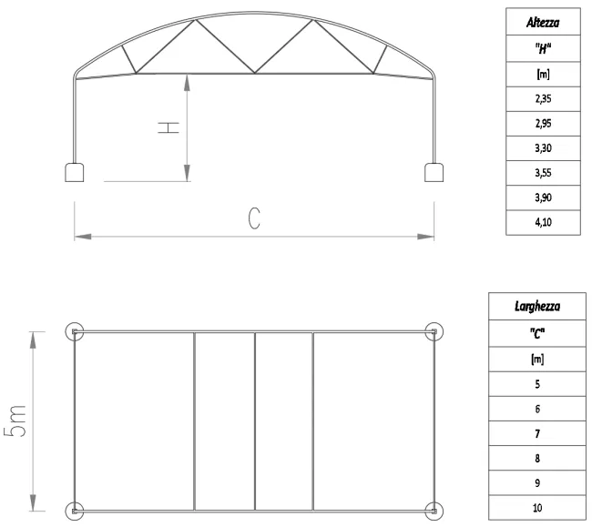 - Tiranti in tubo diametro 32 x 1,5 mm. diagonali a tripla V in tubo diametro 28 x 1,5 mm ed arcarecci diametro 32 x 1,5 mm.